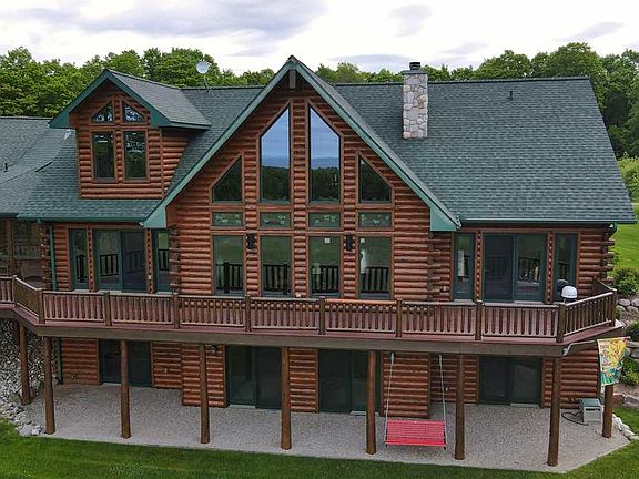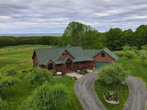 Spectacular 5,000 sq ft, 4 BR, 3.5 BA White Cedar Log home on 60 private acres w/views of Lake MI from every room. Chef's dream kitchen w/ floor to ceiling cabinets, expansive natural stone counters and bird's eye maple flooring throughout main level. Main floor master suite and laundry room. Extensive red cedar decking w/screened and glass porch. Attached lg. 2 car garage, w/bonus room above. Large Pole Barn with workshop, 10' main door, 8' door for workshop and covered firewood storage. Apple tree orchard, rolling meadow, 35 acres of hardwoods with hiking trails on the property. Close to Arcadia Dunes and CS Mott Nature Trails/preserves. Some furnishings included.