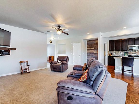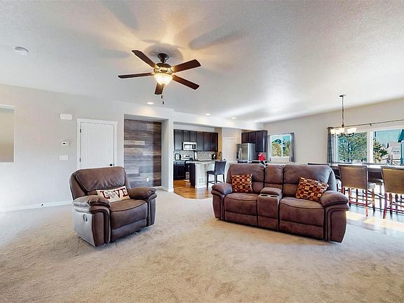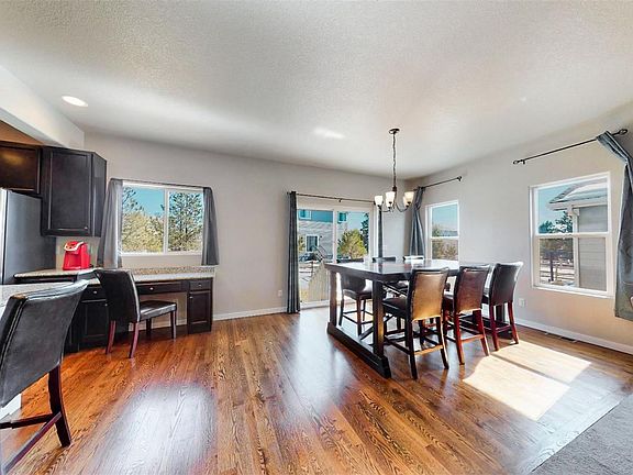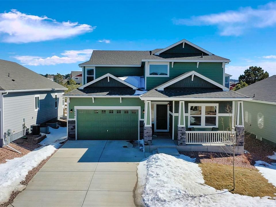 Newly built home with a very open floor plan, gorgeous finishes throughout, large kitchen island, 9' ceilings, backs to a greenbelt/open space area. 4 bedrooms, 3 full bathrooms and a 3 car garage. Main level includes an open kitchen/living room/eating area with stainless steel appliances, upgraded cabinets, real hardwood floors, slab granite counter tops, stunning back splash, butlers pantry, bedroom/office, full bathroom & upgraded carpeting. Large master bedroom w/5 piece master bath, walk-in closet, oversized tub, ceramic tile floors, ceiling fan. W/D on the upper level, full basement with a good layout for finishing, central A/C, humidifier, covered front porch, nice size level yard for the kids to play, split rail fence, mountain views. Great location with highly rated District 38 schools. Close to the USAFA, I-25, & many local amenities.