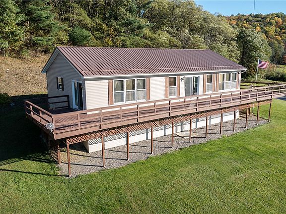LOCATION, LOCATION, LOCATION!!! AND New Price!!! Breath-taking view over the rolling hills of Steuben County! Perched at the top of 35 Hunter's Dream acres, this 1512 sqft ranch has a mostly finished 750 sqft lower, walk-out level. The main floor has laundry hookups (W/D included)), a kitchen with breakfast bar, plenty of cabinets including a slide-out pantry, S/R/DW/Micro (and view!), a combo formal dining area & a living room; naturally well-lit. Beautiful glass panel door to expansive, open, wrap-around deck!! The primary suite also has a door to the deck, a full bath and big walk in closet. There is a second bedroom and a second full bath on this level. The lower walk-out level has two bedrooms, an open area for TV & family room furniture, two storage rooms & half bath. FA furnace, 40 gal water tank and 200 amp CB. POURED CONCRETE FOUNDATION! Central AC just two years old. Metal roof is 9 years old. There is a public electrical pole and a private pole..the utility lines are underground from this private pole to the house. Brown's Septic pumped and inspected the 1000 gallon concrete septic tank in mid June 2024 and it is in excellent condition. Report attached.