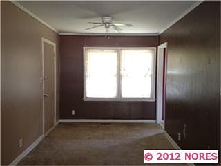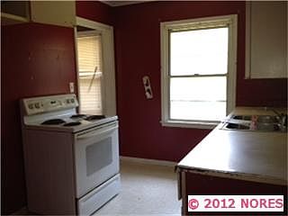 Ranch one-level with siding and covered front porch. Kitchen has range-oven. Living-dining combo off entry. One car attached garage. As Is.