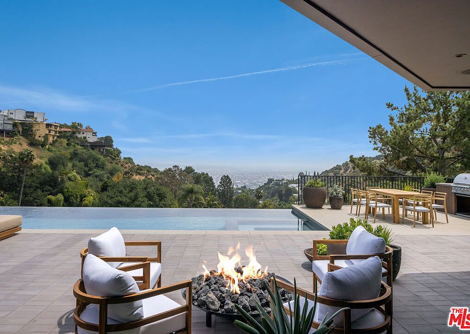Floating high above the city on the Sunset Strip, this reimagined mid-century residence has been thoughtfully restored and expanded to reflect contemporary ease without compromising its storied soul. Past a gated entry, a peaceful zen garden introduces the home with intentionsoft landscaping and clean architectural lines that give way to interiors that feel both elevated and grounded. Terra cotta flooring imported from Spain spans the main living areas, anchoring soaring open spaces where light pours in through floor-to-ceiling sliders and wraparound windows framing unobstructed ocean and city views.A generous formal living room offers both drama and intimacy with warm plaster walls, a wood-burning fireplace, and a custom bar encased in artisan Oak cabinetry. A cozy theater room with concealed bespoke millwork doubles as an additional seating lounge overlooking the front gardens. The kitchen is a singular showpiece, fully customized in rich chocolate and oak tones with an integrated island, Gaggenau appliances, Vola brass fixtures, double fridge/freezer, with stunning Heath tile and Limestone counters with an integrated stone sink. The adjacent dining area opens completely to the poolside deck for seamless entertaining. Once outdoors, a negative-edge pool spills into the horizon, flanked by a volcanic rock fire pit, BBQ/ kitchen area with dining for ten, outdoor shower and bathroom, as well as an epic, wraparound terrace for breathtaking, panoramic sunsets. Adjacent to the formal living room, a conveniently separated family room with a floor-to-ceiling fireplace looks out onto the front courtyard and includes a full bathroom. This area leads to a private guest suite with a luxuriously appointed ensuite complete with soaking tub, shower, heated floors, along with a dedicated work nook, and two separate terraces. Thoughtfully framed for private entry, this wing has the flexibility to serve as an ADU and ideal guest retreat. A second guest bedroom enjoys a skylit foyer, large closet, balcony, and built-in vanity.Each bedroom is designed as a tranquil hideaway, all with private terraces and access to nature. The primary suite is wrapped in glass, oriented toward the horizon and offering sweeping views from bed to bath. Dual walk-in closets and dual bathrooms with radiant heated floors, steam showers, custom cabinetry, a marble soaking tub, integrated makeup vanity, and a refrigerated beauty drawerbring a level of detail rarely seen. A large office with its own walk in closet, ensuite and terrace can flex easily as an additional bedroom, while the gym with convenient small refrigerator opens to yet another private outdoor space. Other notable amenities include a double laundry room with utility sink, Control4 smart home system, and a two-car garage beyond a secured entry.With cinematic views and a soulfully executed interior, this Sunset Strip hideaway delivers a living experience that's as dynamic as its surroundings. Framing some of the most spectacular vistas in all of Los Angeles, this residence offers a front-row seat to sun-drenched days and electric city nights an immersive perspective few homes can rival.