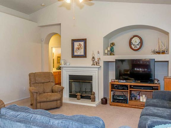 Lovely Lennar, located in Park View Estates, a fantastic neighborhood in Sanger. This home is move in ready, with an inviting front walkway, nice shutters, a front security door perfect for allowing nice breezes to flow in. Once inside, notice the tiled entryway, & fireplace in the great room. There's a pantry, breakfast bar with plenty of room for multiple bar-stools, built-in microwave, tile flooring, & convenient electrical outlets above the counter tops in the kitchen. Overhead ceiling fans with lighting in the living room, bedrooms & over the back patio. The indoor laundry room also features cabinets & a counter. A shower & tub combination can be found in the hall bath, as well as additional cabinets for more storage. Master Bedroom features a walk-in closet, an en-suite bathroom with dual sinks, and a shower tub combo. The backyard is the ideal size, w/large covered patio, fantastic grass lawn & walkway surrounding home & leading to the garage. Save on utilities with paid solar! (no cost to new owner). Incredible value.