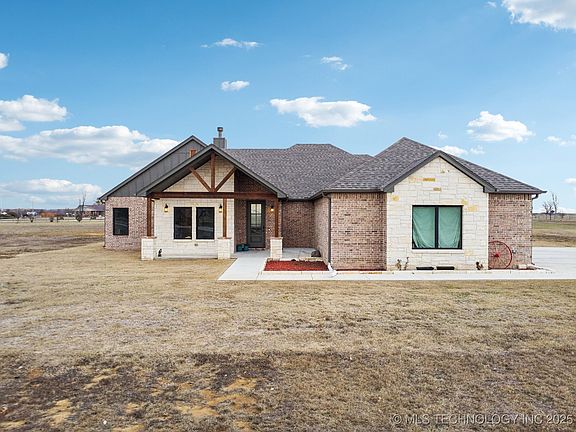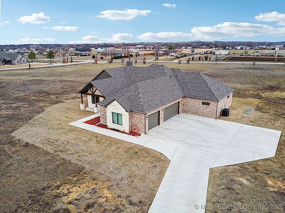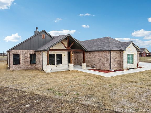 Attention to detail shines in this 4-bedroom, 2.5-bathroom, 3-car garage home on approximately 2 acres, located in the popular Woodberry Farms, less than 20 minutes from downtown Tulsa. If you're tired of dated floorplans and seeking new construction with a spacious garage that can accommodate a truck, room for a shop and a pool, and ample yard space, this home is a must-see. The spacious entry leads to an open-concept living, kitchen, and dining area. Cozy up by the fireplace with built-ins. The kitchen features beautiful Alder soft-close cabinets with Negresco Black Honed Granite countertops throughout, even in the pantry. It also boasts an oversized kitchen island, walk-in pantry, upgraded appliances, large gas cooktop, marble backsplash, and pot filler. The dining area has plenty of space for a large table. The spacious master suite includes a built-in area for a TV, a bath with a separate shower, a free-standing tub, his and hers vanities, extra cabinet space, and a huge closet that connects to the laundry room. The split floorplan offers three additional bedrooms and a large full bath on the other side of the home. Large windows in every room allow for plenty of natural light. The mudroom off the garage features a beautiful built-in area for shoes and storage. The exterior is full brick and stone with full guttering and an extra-large covered back patio. Upgrades include spray foam insulation, tankless hot water, a high-efficiency furnace with 16 SEER AC, and a 200-amp breaker already installed for your new shop. Don't miss out on this exceptional home!