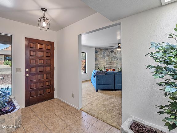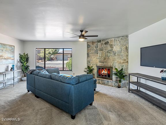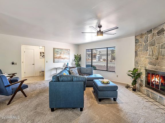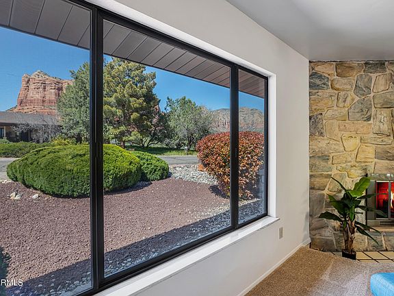 New Roof! New Hot Water Heater! Fresh paint and fresh light fixtures are just some of the improvements waiting for you at this adorable 2 bedroom 2 bath ranch home with front facing Views. Living room showcases a stone floor to ceiling wood burning fireplace! Kitchen offers a breakfast nook, breakfast bar, loads of cabinets, pantry and newer appliances. Laundry room is conveniently located right next to the kitchen! Rear facing Primary bedroom ensuite boasts a walk in closet and both the primary bedroom and the dining area spill out onto a HUGE 36 feet long covered veranda patio perfect for morning coffee or dinner parties. Fido can easily go in and out all day long as the backyard is completely fenced and offers flowering and fruit trees! Picture waking up to Sedona's Red Rocks from the Front Bedroom! Additional features include an attached 2 car garage with built in cabinets and an attached 10 x 3 storage shed at the back patio This sweet home is a short distance to trailheads, shopping, and restaurants. All in all, wrap this one and make it yours