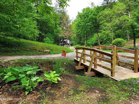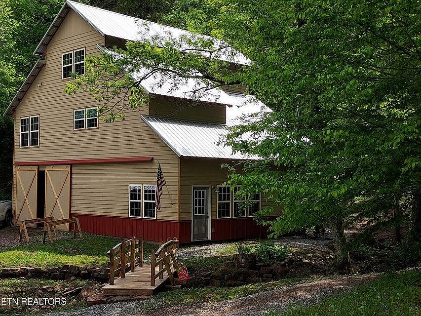 THREE acres of wooded hills and grassy yard surround this private, truly one-of-a-kind, site-built home. Built in 2022, it is designed with a delightful country flair that brings in a more modern feel in all the right places, like in the kitchen where you'll want it, and in its super spacious open layout. The home and its immense garage/workshop are barndominium-like in style. Rough-hewn and barn-wood interior accents, the hobby rooms, and in general, the way the home relates to the simplicity of life, you will find it delivers a ''sweet country'', lifestyle with an elegant touch. Through a very private front porch, just 4 steps above ground level, you'll enter into an expansive, open living/dining/kitchen floor plan. Each area is as large as would be expected with no dividing walls. The kitchen has a massive amount of cabinet and counter space. A wonderful, shelved pantry is at the end of the kitchen. A line of cabinets where stools can be pulled up creates a separation to the living area, and there is room to put a desk or other furniture there. The dining room area is in line with the kitchen to the right of the entry, with the living room area to the left. A short hall with a storage closet leads off to the 2nd bedroom and a really nice bathroom with the laundry at the end. Split stairs rise up from the living area to a bright and open master bedroom that looks out over all with a beautiful view from its high vantage point. It has a walk-in closet and a full bathroom with a large shower. The lower level of the home is all above ground. It is reached from a staircase connecting it to the living area near the kitchen. There are two rooms there, which are fully open to each other, being divided only by the stairway. They are delightful rooms with high ceilings and windows all along much of the length and width. Currently they are hobby and storage rooms. The smaller room holds the water heater and pressure tanks, and a good coal or wood burning furnace. The workshop/garage, approximately 840 sq.ft, lays behind the hobby rooms under the rest of the house. It is accessible from the inside through the hobby room. There is a large parking pad and another spacious shed in front of the workshop/garage. These can also be reached by exiting the hobby room to the great outdoors. You'll cross a lovely custom-built foot bridge over the spring-fed creek into all of these areas and to your front & side yards. The creek runs through and along the property and comes from the spring that feeds the house. This home is truly special in so many ways. Its design intends to meet every need in a very comfortable, low maintenance way. The location is special too. You'll realize you've entered a unique and delightful place as you come into this property from the convenience of the county road. Here, a small assembly of owners thrive together as in their own little country town, with no restrictions and with lots of congeniality and respect. Every home has its owner's personal design to meet their own independent lifestyle. They are all original, site-built homes, each on its own ample spread of land, and each proudly and responsibly kept. I enjoy seeing the little wooden bridges, the out buildings and the cabins along the way, and watching the ducks run in the yard and play in a shallow pond. The llamas in their pen are as elegant as they are cute, and the people here keep chickens and grow gardens. An old chimney remains in the large, level field of what would be the front yard of your new home. Here a garden and fruit trees would flourish. Upon your hills you could keep some goats or other animals of your own. Beautiful trees and flowers fill these woods, and the hills will wrap you up in your own amazing world within the Appalachian Mountains of NE Tennessee.