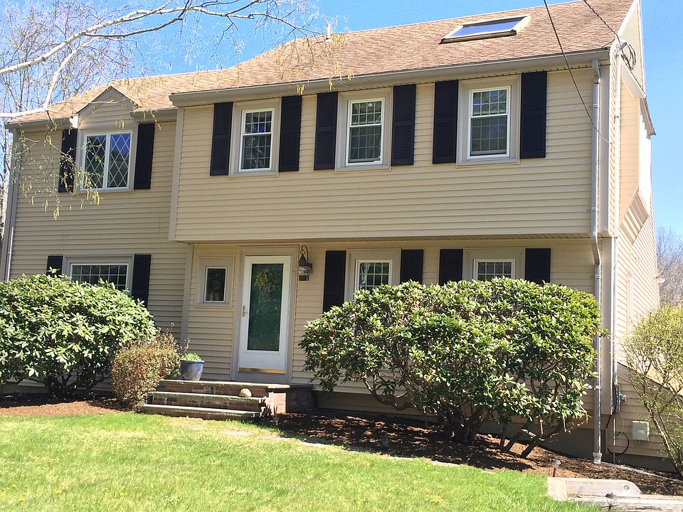 You will fall in love as soon as you enter this sun filled expanded colonial with many unique features that make this home a must see. Natural light from 3 large picture windows & sliders in the family room with wood beamed cathedral ceiling. Gleaming hardwood floors or tile on first floor. Open concept Chefs kitchen with plenty of cabinets, granite countertops & stainless appliances. Large gatherings expand nicely into the dining room with fireplace and two sliders leading to large deck.Also adjacent to kitchen is a playroom/den/home office. 1st fl bedroom is great for guests with easy access to full bath or open the French doors that overlook dining room and have another family room. 2nd fl has a nice overlook into the lower level. Master bedroom has cathedral ceiling, beautiful window, walk in closet,direct access to 2nd full bath. Two add'l bedrooms. Gym/playroom in the basement. Central AC, Close to an acre of land with plenty of privacy, fenced yard & possible pool.Welcome Home