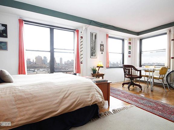 Large, top-floor, corner alcove studio apt. in fabulous Fort Greene/Clinton Hill. This Clinton Hill Co-op apartment has an unobstructed panoramic view of Manhattan, Brooklyn, and Queens that will mesmerize you! Elevator, package room, 24-hour security, on-call maintenance, large washer/dryer room in basement, trash chute, basement recycling, wired for TimeWarner/Spectrum (FiOS coming soon). The apartment has a roomy and airy layout, parquet wood floors, dishwasher, full kitchen & bathroom, and three big closets. Heat, water & cooking gas included. Beautiful Fort Greene Park is just six blocks away. Both Myrtle and DeKalb avenues are minutes away, each lined with amazing restaurants, boutiques, cafes, bars, and grocery stores. BAM, Theater of the New Audience, and Barclays Center are close by. Trains nearby include the G and C to Clinton-Washington; plus the B, Q, R, 2, 3, 4 and 5. Fort Greene is also home CitiBike docks. Buses include the B38 (local and Limited service), B54, B52, B69, and several more. Commute to Lower Manhattan in about 30 min. or less; commute to Midtown in about 45 minutes.