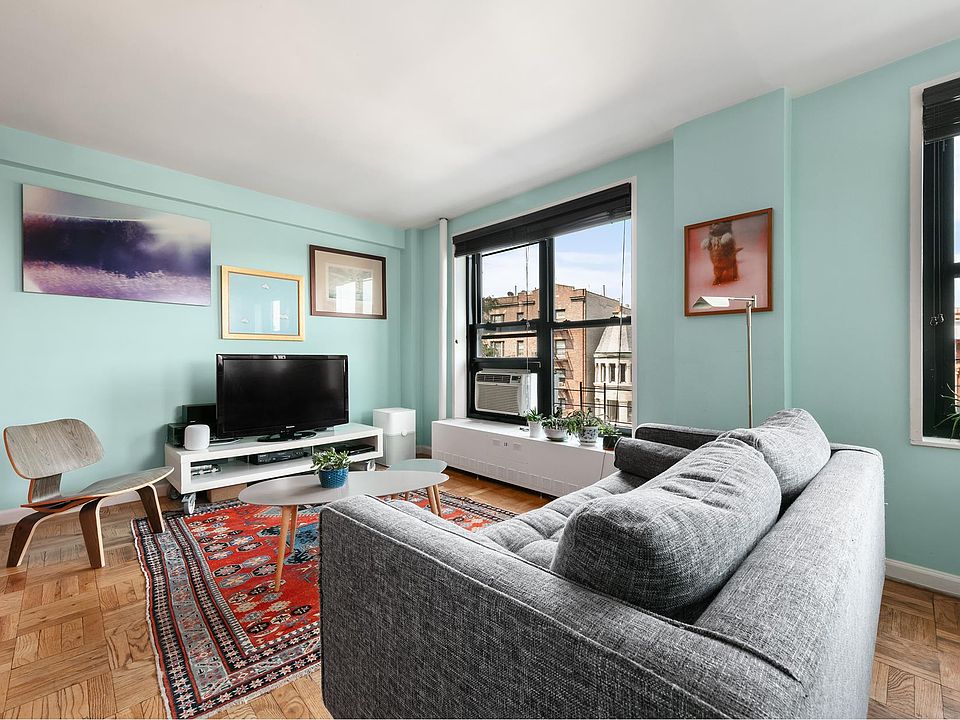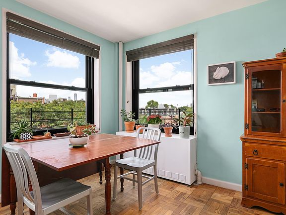 Perched among the treetops of Clinton Hill, this sunny, one-and-a-half-bedroom apartment is the upsizers' work-from-home dream. As you enter through a gracious hallway you'll discover a living room with three oversized windows, multi-directional city views, and a corner exposure which keeps things bright and light. Custom bookcases create a reconfigured sleeping quarters that maintain a perfect pair of air and light flow. A separate office alcove with a custom floating desk and built-in shelves creates a distinct work-from-home space right outside an updated, windowed kitchen. An oversized primary bedroom currently serves as a child's room comes with ample closet space. Bathroom is classic pre-war, with updated fixtures, subway tile and checkerboard floor. Near to beautiful and historic Fort Greene Park and its well-known farmers markets, the Clinton Hill Co-op complex is a longstanding pillar of the Clinton Hill neighborhood, with a full-service staff of porters and maintenance and security personnel. There is a laundry room with brand new machines in the building, and the co-op also has a package room and bike storage. Located at the intersection of Fort Greene and Clinton Hill, you are close to local favorites like Aita, Mekelburg's, Olea, Colonia Verde, Roman's, and many, many more. The G train is two blocks away, and the B, C, Q, 2, 3, 4, 5, D, N, and R trains all close by. There is a 5% flip tax, paid by the seller, pied-a-terres are allowed, as is subletting after two years of ownership. All utilities except for electricity are included in the maintenance and your pets are welcome members of the community.