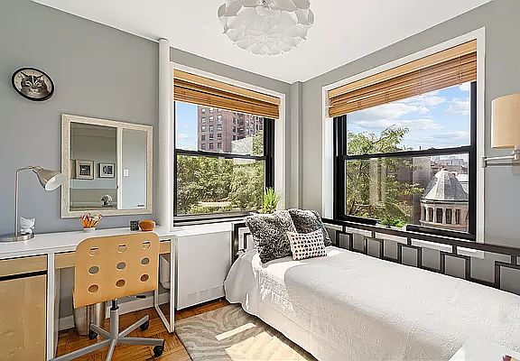 Awash in beautiful light, striking views await at this newly renovated and meticulously maintained home currently used as a 2 bedroom at the Clinton Hill Coops! With western and southern exposures, it's six over-sized windows bring the outside in and provide the perfect vantage point sweeping over the historic brownstones and treetops of the charming neighborhood to the stunning Manhattan skyline. The flexible layout has been thoughtfully designed to maximize the generous space and is freshly painted throughout. A classic entry foyer and hallways incorporate new Shaker-style doors for the 3 large storage closets. It opens to an airy living room that easily accommodates a separate dining area. A flex space off the living room has been transformed into a second sleeping area.This lovely corner room has double exposures and a French-style door that adds privacy and filtered light into the space. Its custom closet and a drawer unit with shelves plus an adjacent bookcase offers multi functional possibilities, making it ideal for a bedroom or office. The contemporary windowed kitchen is nicely appointed with ample white cabinetry, tiled backsplash, Caesarstone countertop, stainless steel appliances - including a new energy efficient refrigerator and lighting- and new over the stove microwave. The bathroom has also been newly updated and has a stylish barn door with a panel of opaque glass that provides privacy and expands its spacious feel. The expansive primary bedroom is spacious enough to fit a king-size bed as well as a comfortable work from home space and a double closet. Other features of this special home include warm parquet floors, new radiators with temperature control and all new windows, providing additional insulation and ensuring a tranquil living space. The elevator building features a 24-hour doorman/security, common landscaped courtyard, on-site maintenance staff, renovated laundry facilities, and bike storage. Centrally located in prime Clinton Hill and nearby to Fort Greene, it provides proximity to both neighborhoods' vibrant amenities, all while surrounded by historic architecture and sumptuous tree-lined streets. Less than one block to shops and restaurants on Myrtle Avenue and minutes to the C and G trains (nearby to Barclays Center subway access, too) as well as Fort Greene Park. Pied-a-terre are permitted as are sublets permitted after two years of ownership. Pet friendly.