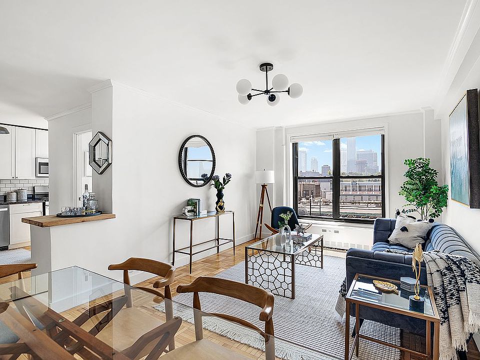 You enter the apartment into a foyer with a large coat closet. Continuing farther down the hall you will find the large, open and bright living and dining room. Western-facing windows bring tons of natural light in and showcase the dazzling sunsets over Manhattan views. The windowed kitchen features granite countertops, white shaker-style cabinets, stainless steel appliances, dishwasher and subway tile backsplash. Adjacent to the kitchen is a thoughtfully designed bonus room. This extra room could easily serve as a nursery, den, office, or 2nd bedroom. The renovated bathroom features white subway tiles and stylish wood accents. The large bedroom boasts great light with views over the treetops facing west. The bedroom can easily fit a king-sized bed. A fully built-out, oversized closet allows for organized storage.