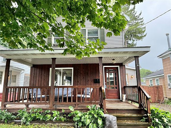 Happy front-porch sitting, 3 bedroom city home! This little gem features a fantastic front porch! It's perfect for enjoying your early morning coffee or the relaxing atmosphere that a big porch can provide. When you enter the home, there is a large carpeted living room, a half bath, and it features a first floor bedroom! A built-in closet storage unit allows for coats and shoes to be organized and out of the way. The updated kitchen features tile flooring and backsplash, along with plenty of counter and storage space. Off of the kitchen, it has a great pantry and laundry area for ideal convenience and access. The kitchen overlooks a fenced in back yard with plenty of space and features bulkhead doors for access to the basement. Upstairs you'll find the other two bedrooms of the home. The primary bedroom sports glass closet doors, built-in headboard with lighting, and hardwood floors. The full bath upstairs features tile flooring and a mirrored vanity station with lights. Don't wait on this little city gem, inquire today and make your dreams, a reality!