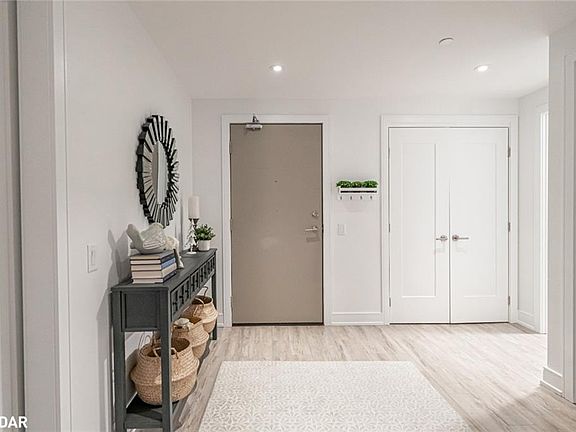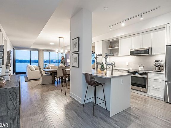 LUXURY WATERFRONT LIVING AWAITS IN THIS STUNNING NEWLY BUILT CONDO! Discover modern elegance in this 2023 built high-end waterfront building, offering the largest middle unit spanning an impressive 1,337 sq. ft. Ideally located in the heart of downtown, you’re just steps from shops, restaurants, the pharmacy, North Shore Trail, library, beaches, parks, and so much more. Step inside to a professionally repainted condo showcasing captivating views of Kempenfelt Bay through floor-to-ceiling windows. The open-concept dining and living room features a sophisticated tray ceiling and a walkout to an enclosed sunroom, perfect for enjoying the views year-round. The lavish kitchen is a chef’s dream, boasting upgraded pull-outs, sleek countertops, elegant white cabinetry, and stainless steel appliances. Retreat to the expansive primary suite with double closets, a walkout to the sunroom, and a spa-like ensuite featuring dual sinks and a walk-in shower. The versatile den offers flexibility, ideal as a home office or guest bedroom, and is complemented by a beautifully appointed 4-piece guest bathroom. Convenience is at its finest, with an owned locker and in-suite laundry equipped with a stackable washer and dryer, stylish shaker cabinets, and a handy clothes rod. This luxury building is packed with exceptional amenities, including a gym, sauna, steam rooms, hot tub, guest suites, a party room, boardroom with adjoining kitchen, and rooftop decks with BBQs. The final builder inspection has been completed, with all deficiencies resolved, ensuring a move-in-ready experience. Enjoy unparalleled waterfront living in this modern and luxurious condo - don’t miss this rare opportunity to make this your #HomeToStay!
