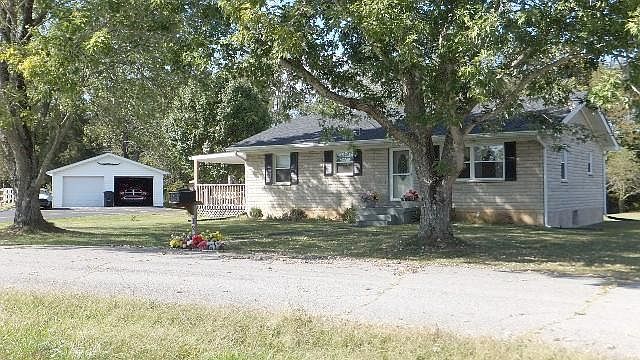 Hail damage 2011: new shingles on roof of house, stg. bldg. & garg., vinyl siding on left side of garg. New gutters on garage. Bedford stone ranch w/full unfinished basement in desirable location - Trapp area. Backs up to woods. Living room, 3 bedrooms, 2 full baths (one is in basement), washer & dryer hookup has been moved to kitchen area on main floor, large eat-in kitchen. NEW gutters, and water heater in 2010. NEW replacement windows, bathroom door, kitchen faucet, carpet in living room, B-DRY in basement with new sump pump, French doors in basement in May 2011. All electric. Two-car detached garage (30' x 24'). Central H/A. Corner lot (.5 acre). Storage building. 1.5 miles from Fox's Grocery (hot meals and gas) and fire department. Owner plans to take the John Deere light/fan in the kitchen. Paneling has been added to the walls and ceiling in the bsmt. in a bedroom and family room. Carpet laid--no padding. Added a roof to the side deck by the kitchen.