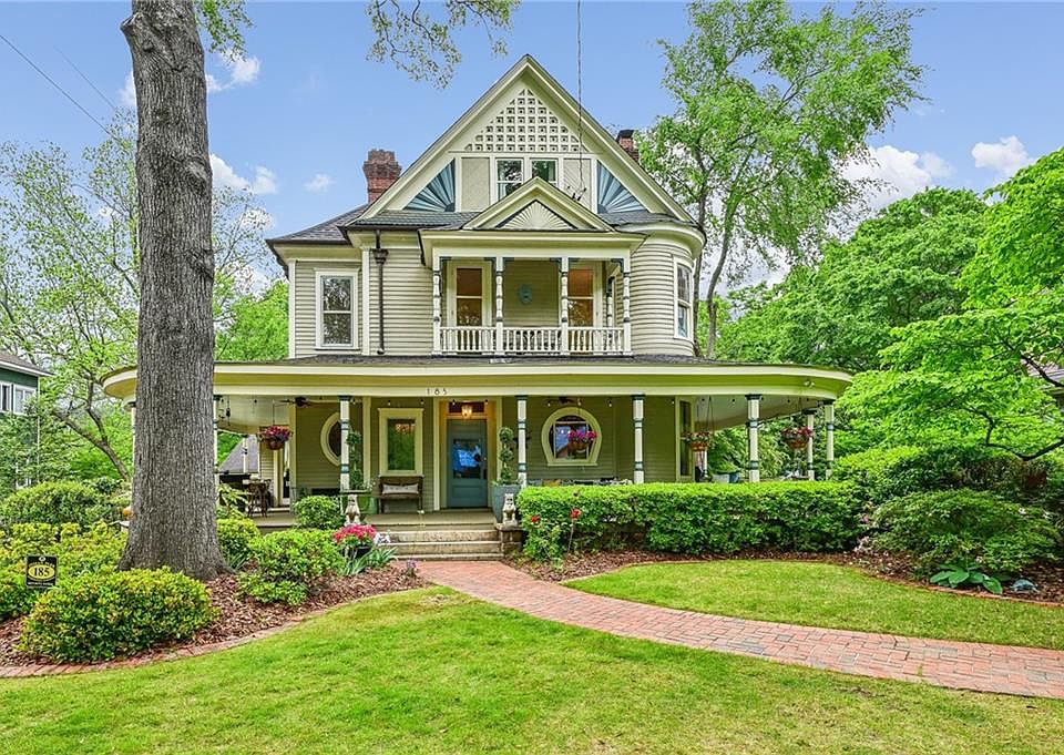Finally! An opportunity to make 185 Elizabeth Street yours! This 1896 landmark property is one of Inman Park’s (and, thus, Atlanta’s) earliest homes and has been lovingly maintained and updated over the years to preserve and enhance its historic character. Set perfectly at the crest of Elizabeth on over a half-acre in the center of the neighborhood, this Victorian 5-bedroom 3.5-bath home has nearly 5,000 square feet of conditioned space and a perfect floor plan that blends charm with convenience. An unrivaled double wrap-around front porch is just steps above the wide and level front yard. A vestibule leads you into a grand foyer with parquet floors, antique Italian sconces, a grand staircase, and a Czech Bohemian crystal chandelier. Beyond the foyer is a huge living room with coved ceilings, a working fireplace, and a custom dry bar. Additional features of this level include a large corner study, a den or formal sitting room, a library, a wine cellar, and a secluded powder room. The gourmet kitchen is perfect for entertaining and has a Viking range, a large island that can fit four comfortably, a banquet area, a pantry, and a beautiful view overlooking the stunning back yard. The sizable dining room and kitchen both open out to the rear deck. The 2nd floor offers a beautiful central hall and stair landing and a large primary suite with a double walk-in closet and spa bath. Two sizable secondary bedrooms, an updated secondary bath, a sunny laundry room, and a covered front balcony complete this level. The third floor has two additional bedrooms, a full bath, and an additional lounge area. There are operational fireplaces in the living room, parlor, and two bedrooms upstairs, and a total of nine fireplaces throughout the house. Outside, the nearly .6-acre lot means you have room for a huge garage/carport, and privacy from your neighbors. The deck and patio overlook a turfed sport court area, and the larger rear back yard of the lot is a part of the famed "hollow" - a French cul-de-sac of green space. Soaring ceilings, nine fireplaces, pocket doors, heart pine floors, beautiful intact Victorian architecture and finishes. Skyline views in the front, and dark wooded views at the rear. This grand home offers the best of both worlds and is just steps from Inman Park Village, Krog Market, Freedom Park, and the Eastside Beltline Trail. Check out the video tour of the house, linked below!