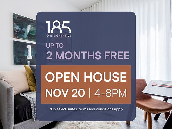 - Special offer! Join us for an Open House at One Eighty Five - Join us at our Open House on Thursday, November 20th, from 4:00 PM to 8:00 PM. Receive up to 2 months free rent on select suites.