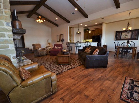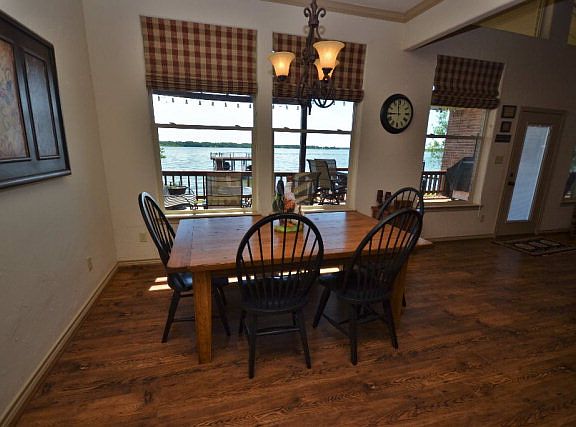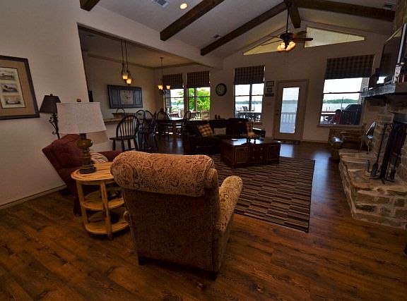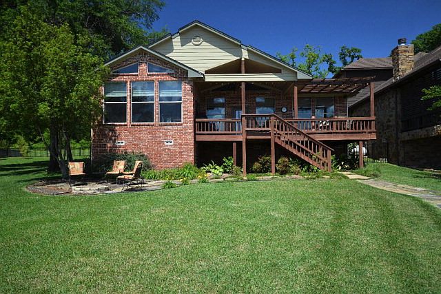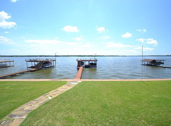 Two fenced wide open DEEP water lots, east facing so you can actually sit comfortably on the covered deck on a Texas summer afternoon! With the adjacent waterfront lot there is room between neighbors and room to set up the volley ball net, hang the hammock on one of the many trees, build a pool, or just let the kids and dogs run around! Approx. 10 feet under the boathouse when lake at full pool level (per seller). Nice boathouse with boat slip, PWC slip, covered sitting and party deck. Big open living floor plan with vaulted ceiling. A clean, no fuss lakehouse! Includes most furnishings!