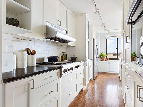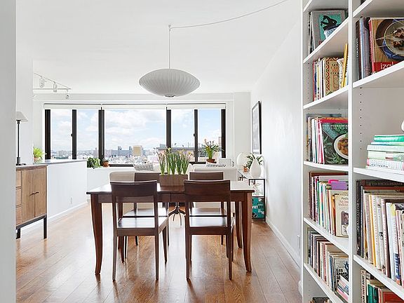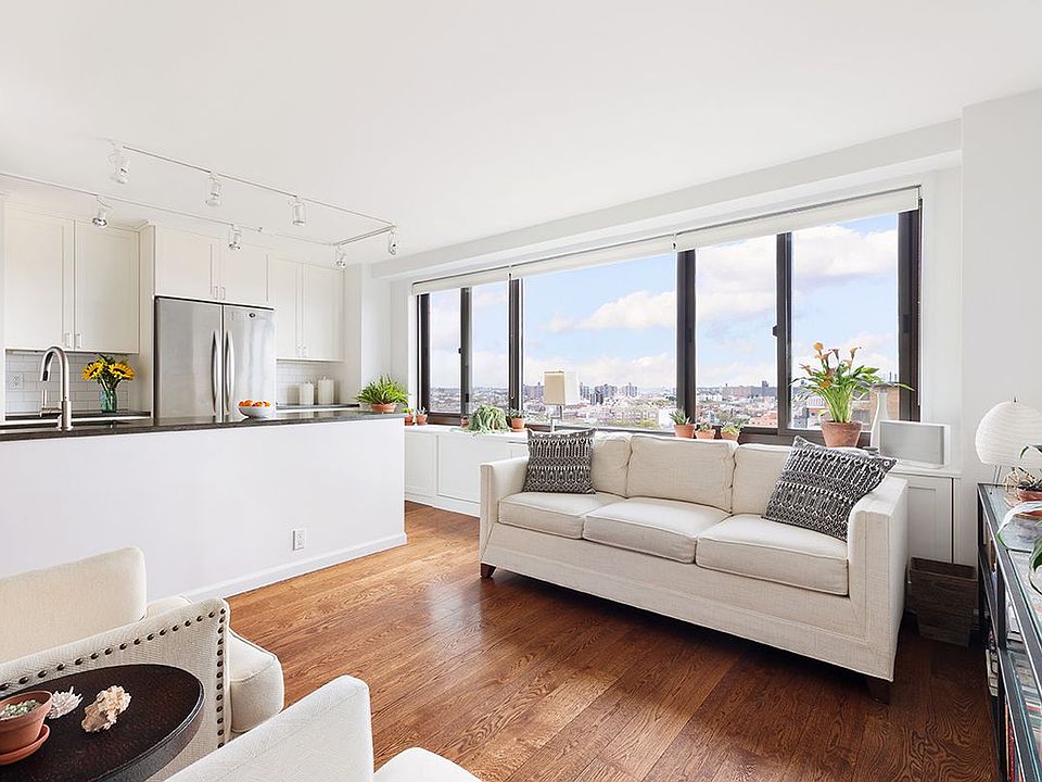 Located on the top floor of a centrally-located Clinton Hill co-op, this stunningly gut-renovated 2 BD / 2BA corner apartment affords breathtaking views of the Manhattan skyline. The combined living and dining space is bright and open, brilliantly lit by over-sized windows spanning the length of the room and featuring deep window sills with Corian tops and integrated storage. The chef's kitchen has been thoughtfully expanded to include beautiful honed countertops, abundant storage and counterspace, and a culinarian cooktop with grill and wok insert. Off the master bedroom is a large balcony with unobstructed views of the East River -- perfect for watching the fireworks on the 4th of July. Both bedrooms have large windows with expansive views and double-closets completed with Elfa storage. The two full bathrooms feature high-end fixtures, subway tile, and Corian countertops, the hall bath a soaking tub and the en suite a walk-in shower. The house-sized storage includes a walk-in pantry, a double closet in the entry and utility closet in addition to the generous bedroom closets. Reclaimed 6" oak floors are found throughout the apartment and all windows feature custom shades (light-filtering in the living space and blackout in the bedrooms). Amenities at Willoughby Walk include a 24/7 secured front entrance, resident super and maintenance staff, laundry facilities, storage space and bike storage, and parking (wait-list). The building also has a recently renovated lobby and elevators. Co-purchasing allowed and pet friendly. Located in the heart of historic Clinton Hill and nearby to Pratt, the thriving businesses along Myrtle Avenue, and subway access (Clinton/Washington Ave G train).
