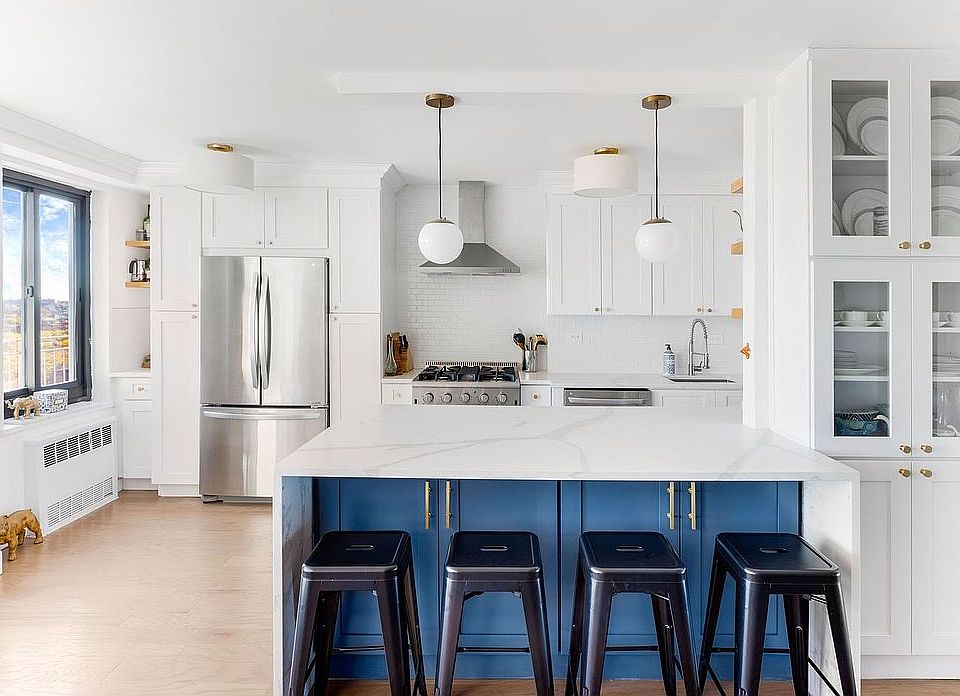 This top-tier residence is truly one-of-a-kind, unlike anything ever sold in this building before, with no neighbors above, complete privacy, and dramatic north, south, and east exposure. Upon entering the penthouse, you are embraced by its over-sized, open living room, kitchen, and dining layout, filled with large windows and ample sunlight. A stunning, state-of-the-art kitchen greets you with a giant white quartz waterfall island, large enough to entertain, with a breakfast bar. This open-island chef’s kitchen features all stainless steel appliances, including a Thor oven and overhead range and LG refrigerator and dishwasher, as well as a clean white subway tile backsplash, ample cabinetry and storage featuring brass hardware, a built-in china cabinet, stylish light fixtures, and an engineered oak hardwood floor.