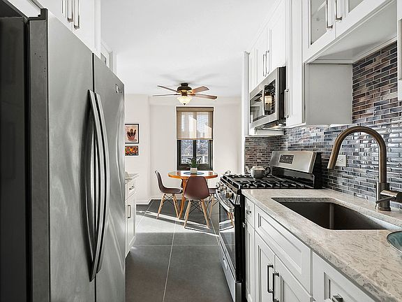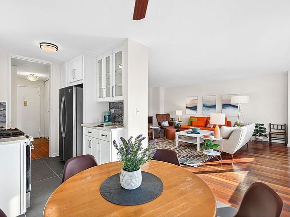 Great storage starts with the double entry closet. Substantially sized, the living room will support your choice of furniture and room arrangements, but there's no need for compromise since there's a dedicated windowed dining area just off the kitchen. The galley kitchen has been renovated with a five-burner range, French door refrigerator, glass-tiled backsplash and clean white cabinets with glass uppers. Both bedrooms are beautifully sized and offer double closets (one more closet in the hallway is perfect for linens.) The guest bath has a tub and shower while the newly renovated en suite primary bath has an oversized glass-enclosed step-in shower.