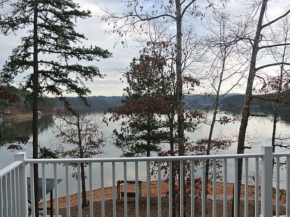 Stunning setting for this 5BR/3BA home with 341 feet of shoreline! Awesome unobstructed views! New windows, new siding, enlarged master and office and laundry room addition. Open floor plan with vaulted ceilings in great room and fireplace, country kitchen with granite counter tops, and spacious dining area. Master suite on main level with sitting area. Two bedrooms on upper level with full bath. Terrace level has den with fireplace with walk out to covered patio and entertaining area to enjoy the awesome views of the lake from all directions. Two additional bedrooms and full bath on terrace level as well as ample storage. Dock with sundeck built in 2019. Detached 2 car garage with finished room above. This easy walking point lot is a rare find and beautiful setting on the lake.