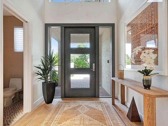 Your dream home in Admirals Cove awaits! This rare point lot offers 300 feet of waterfront with breathtaking views on three sides, including spectacular southwest sunsets. Completely and tastefully remodeled, the residence showcases a timeless transitional design with an open floor plan. Inside, you'll find four bedrooms, each with its own en suite bath, plus a powder room. Finishes include French oak wood floors with a herringbone-pattern foyer, a cathedral tongue-and-groove ceiling, a floor-to-ceiling marble fireplace, Lutron lighting, and impact windows. The gourmet kitchen features Carrara marble countertops, JennAir appliances, double ovens, a six-burner gas cooktop, and a wine cooler. Enjoy the serene outdoor living areas in total privacy from your pool, spa, and multiple seating... areas across nearly a half-acre of lush grounds. The lot can accommodate a boat up to 65 feet, offering easy access to the Intracoastal with no fixed bridges. This exceptional property also offers opportunity for expansion.