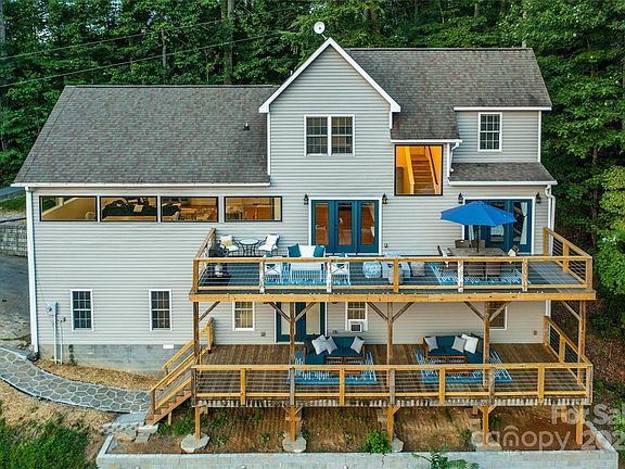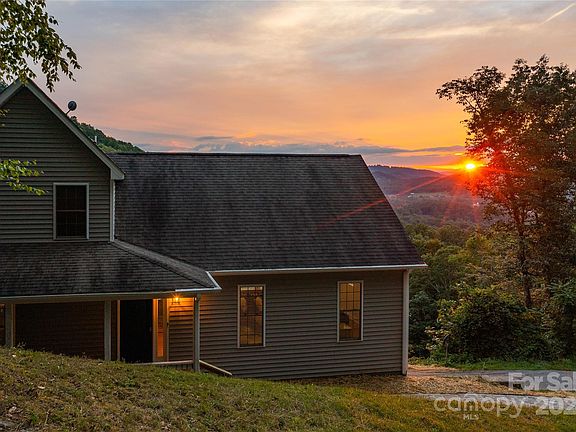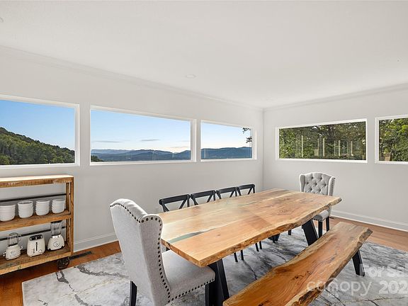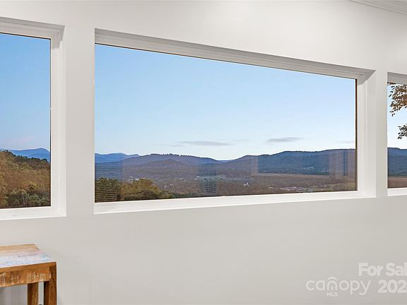 A picturesque 4-acre estate, this modern oasis offers unparalleled mountain views. Tucked away in the forest, this property provides a seamless transition from city life to mountain retreat, all while being conveniently located just 10 miles outside of Asheville. Upon arrival, you'll be captivated by the open floor plan layout, designed to showcase the surrounding natural beauty. The centerpiece of the home is the wrap-around picturesque windows, framing breathtaking views. The kitchen blends form and function, featuring a marble island, stainless steel appliances, and custom cabinetry. The main-level primary suite is a sanctuary of serenity, offering expansive views from every window.The spa bathroom is complete with a deep soaking tub, rain shower, his-and-her sinks, and a spacious walk-in closet. The upper level features 3BR/1BA while the lower level offers additional room for guest with 2BR/1BA. Outside, adventure awaits just beyond your front door, with endless opportunities.
