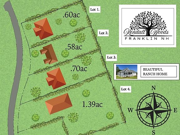 Affordable new construction is here, at Kendall Woods in Franklin, NH. This new subdivision provides four lots all over 1/2 acre with a wooded back yard, convenient location in a country setting, city water and sewer services, and professional high quality construction ready for next Spring. This ranch model with 2-car garage is a proven winner, providing all the creature comforts you are looking for. The spacious open concept living space allows for a free flow of family and guests. The living room is bright and airy with soaring ceilings. The sizable kitchen comes complete with granite countertops, stainless appliances, ample cabinetry, peninsula seating, and a comfortable dining space. A short hallway gives way to a primary bedroom suite with its own bath and double closets. Two other bedrooms, spacious shared bath, and convenient laundry complete the package. Franklin has a bustling downtown, water park, hospital, and other amenities. Kendall Woods is in a quiet and wooded section of town, with easy access to RT 93. A great commuter location for working anywhere in the Lakes Region, Concord, or even Manchester. Also a great place to live and work locally, enjoying the local lakes and mountains. There is always something to do in New Hampshire, and this new neighborhood is just the place to start each day. Pics are of a previous build of this model in another location and may include customer choices or minor upgrades. Subject to final subdivision approval.