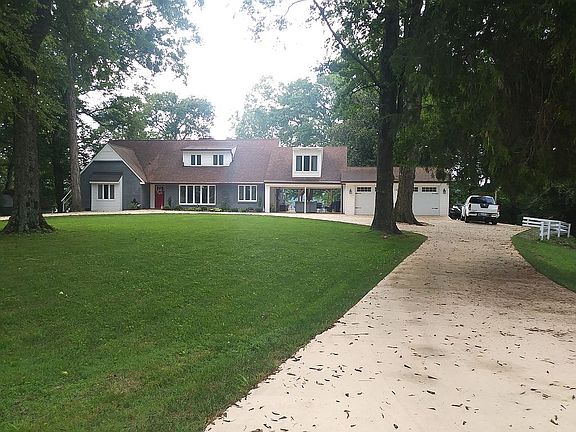 Five BR, two story brick primarily Cape Cod style house with garage on large, private lake lot with large trees but open view of lake and private dock. Located as next to last house on a dead-end road with a view of farm fields in front of house.