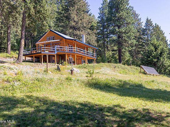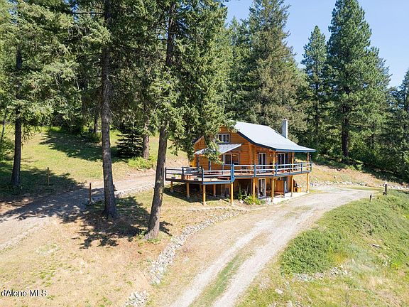 A well-crafted true log home with log beams and tongue and groove ceilings. This home has been completely refinished w/ newly stained logs & chinked inside/out & walk out basement. Park-like property surrounded by mature trees on 3.44 acres overlooking Garfield Bay, Green Monarch Mts, and Scotchman Peak. Multiple covered and uncovered decks with a sunken spa hot tub to relax with the stunning views. 650 ft deep private well and septic. Separate breaker panel for a generator. A separate building for a guest house/airb&b, office or art studio with restored antique parlor wood stove, plus 2 sheds. Home is heated w top of the line efficient survival wood stove, Pellet stove and electric forced air furnace. Many essential extras are included- riding lawn mower, gas mower, chicken coop, cedar infrared sauna. This property is MAGICAL!!