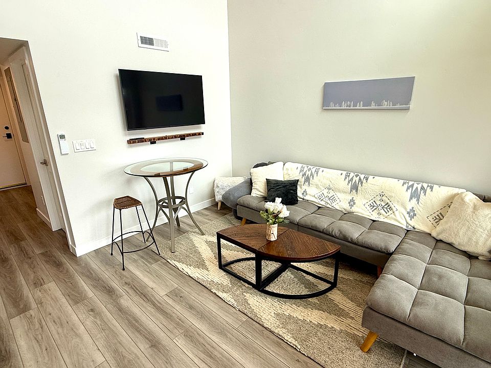 Brand new loft apartment located across the street from Summit Co. bus station for easy access to other mountain villages as well as walk to grocery shopping and dining/entertainment. Fully furnished with a Queen bed ( new mattress ), couch/futon, smart tv, full kitchen, washer/dryer. Covered parking space with ev charging. Owner is responsible for water and WiFi, tenant would be responsible for the electricity use.
