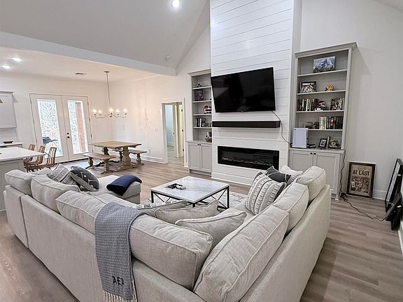 Beautiful 3-bedroom, 2-bath home built in 2024 featuring an open-concept layout. The living area is centered around a gas fireplace that adds warmth and inviting ambiance. The kitchen offers a gas range, large island with built-in microwave, and a spacious window over the sink overlooking the backyard. Step outside to a covered patio accented with stained wood ceilings—perfect for relaxing or entertaining. The split floor plan provides privacy, with the primary suite on one side of the home and two bedrooms with a shared bath on the other. Convenient entry from the garage includes a built-in storage area with bench, ideal for everyday organization. Call today for an appt