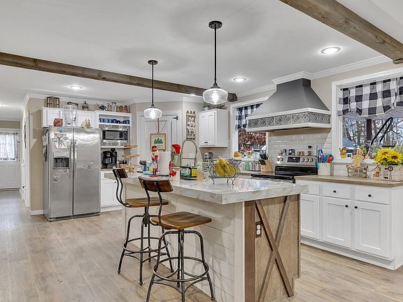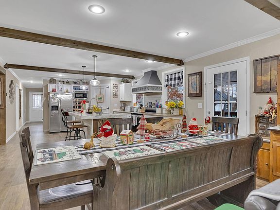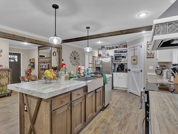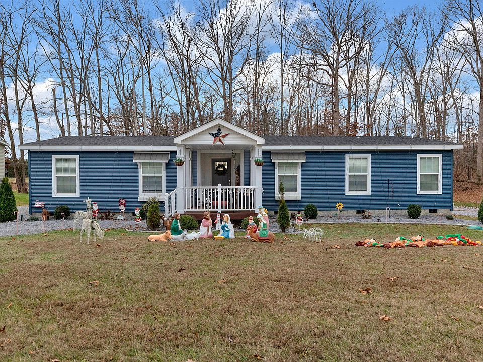 Step into the serenity of this Freedom Farmhouse by Clayton, a meticulously crafted 3-bedroom, 2-bath haven spanning 1,920 square feet of pure comfort. This spacious residence seamlessly marries modern elegance with classic farmhouse charm. As you enter, be captivated by the allure of crown molding, beams, and shiplap accents throughout, creating a warm and inviting atmosphere. The living room welcomes you with an electric fireplace, promising cozy evenings with loved ones. The heart of the home, the kitchen, boasts butcher block countertops, a subway tile backsplash, and a luxury range hood, all set against the backdrop of shiplap-clad walls. The kitchen island adds both functionality and style. Luxury vinyl flooring graces every inch of this home, leading you to three bedrooms adorned with walk-in closets, ensuring ample storage space for all. The primary bath invites relaxation with a soaking farm tub, while the secondary bath continues the farmhouse theme with thoughtful touches. Step outside to your private retreat—a 12x15 covered back deck, perfect for alfresco dining, and a covered front porch, where you can unwind as the world goes by. The property extends to .38 acres, featuring a 10x12 hand-built storage building for all your organizational needs. Illuminate your space with recessed LED lighting throughout, creating a warm and energy-efficient ambiance. The laundry room is not just functional but stylish, accompanied by white rustic stand-up cabinets. The backyard is a haven for both relaxation and play, boasting a firepit surrounded by Adirondack chairs, a greenhouse, and raised garden beds for the green thumb in you. This real estate gem offers the best of both worlds - a serene retreat in a private cul-de-sac, coupled with easy access to the essentials of modern living. Welcome to Freedom Farmhouse, where every detail has been thoughtfully curated to offer not just a home, but a lifestyle—a place where memories are made and freedom reigns.
