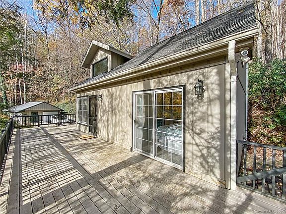 Mountain cottage in Maggie Valley Country Club Estates....features 2 bedrooms and 2 baths with a loft that could be used as an additional sleeping area....extra large front deck for entertaining plus a raised deck in the back that would be perfect for a very private hot tub...stone fireplace with gas logs with remote....kitchen has stainless steel appliances....detached garage with 1 car space plus workshop and storage area...small stream at edge of property....furniture may be purchased by separate agreement....