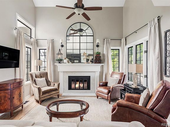 The cozy living room boasts a wood-burning fireplace with a marble surround and custom mantle, vaulted ceilings, and a beautiful wood beam that adds warmth and character. Restoration Hardware-style lighting throughout the home elevates the entire aesthetic.