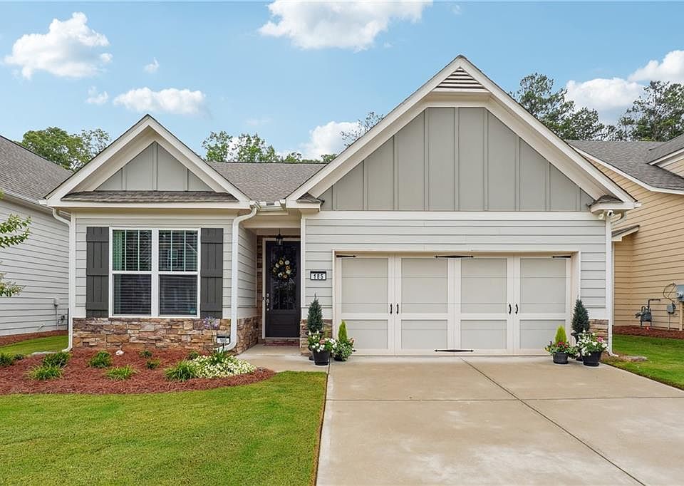 Welcome to this beautifully appointed 3 bedroom, 2 bath, single-level home in the highly sought-after NatureWalk active adult section of a vibrant, amenity-rich community. Blending comfort, style, and low-maintenance living, this home boasts rich hardwood floors, crown molding, and tasteful designer accents throughout. The open-concept layout is light-filled and inviting, anchored by a spacious great room with a cozy gas fireplace and upgraded lighting. The chef’s kitchen is a showstopper—featuring pristine white cabinetry, granite countertops, stainless steel appliances, a walk-in pantry, and elegant finishes that flow seamlessly into the dining and living areas. The primary suite is a true retreat, complete with a tray ceiling, two walk-in closets, and a spa-like bath offering dual vanities, a tiled shower, and beautiful tile flooring. A laundry/mud room with a built-in drop-zone bench adds everyday convenience, while two additional bedrooms provide flexible space for guests, an office, or hobbies.Step outside to a private, fenced backyard where a covered porch with a stunning stone fireplace overlooks peaceful wooded views—the perfect setting for relaxing or entertaining year-round. A two car garage, professional landscaping and exceptional curb appeal complete the package. Residents enjoy a low-maintenance lifestyle with lawn care, trash service and a full calendar of planned social events included. Community amenities abound—clubhouse, walking trails, golf cart paths, dog park, junior Olympic pool, pickleball and tennis courts, basketball courts, and a full-time lifestyle director. This is more than a home—it’s a lifestyle you’ll love coming back to every day.