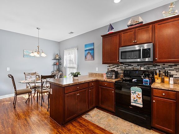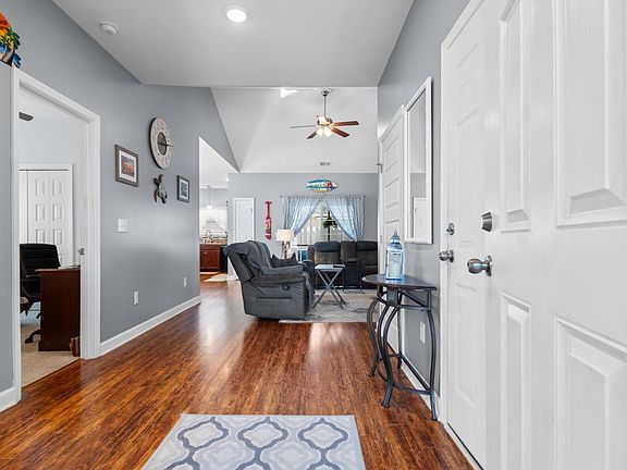This beautifully maintained single-story home offers the perfect blend of style, comfort, and coastal charm. The inviting exterior features a soft sage green facade with crisp white trim, complemented by decorative accents and a charming front patio area, perfect for morning coffee or evening relaxation. The extended driveway leads to a spacious two-car garage offering ample parking and storage. Inside, the home features a combination of wood-look vinyl flooring, tile, and carpeted rooms, offering both style and comfort throughout. The spacious master bedroom boasts a deep blue accent wall, luxury vinyl plank flooring, and a ceiling fan, creating a serene retreat filled with natural light. The combo dining room and kitchen is both stylish and functional, featuring wooden cabinetry, a cathedral-style ceiling light, and a breakfast bar with seating. The kitchen is well-appointed with stainless steel appliances, a range, built-in microwave oven, and a stylish tile backsplash. Abundant counter space and a large double sink make meal preparation a breeze. A washer and dryer are also included for added convenience.Outdoor living is a highlight, featuring a cozy screened in porch and extended tile patio. This home combines comfort, style, and functionality in a desirable Myrtle Beach location. Schedule your showing today!