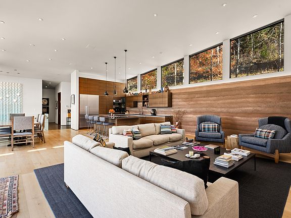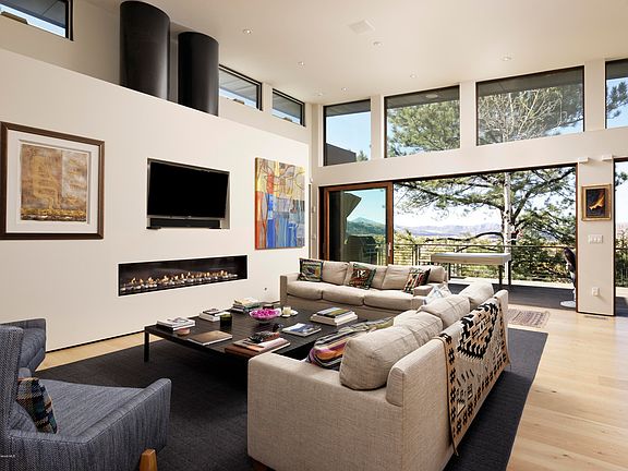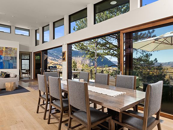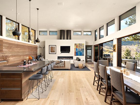 This contemporary masterpiece overlooks Aspen from the private east side of town. Walk into an open floorplan with gourmet kitchen, dining room and generous living room with floor-to-ceiling glass doors, taking in the valley below. The master suite is on the main floor, while the lower level has two bedrooms and a bunk room, each with their own walkout to a shared patio. The gym can be set up as a fifth bedroom with queen bed. High end appliances, fixtures and furnishings, and tasteful design make this an elevated mountain retreat that has been featured in LUXE Magazine. Available exclusively from mid-December 2020 through mid-January 2021.