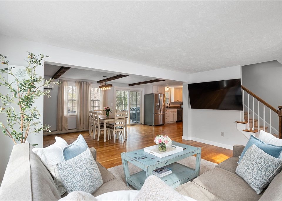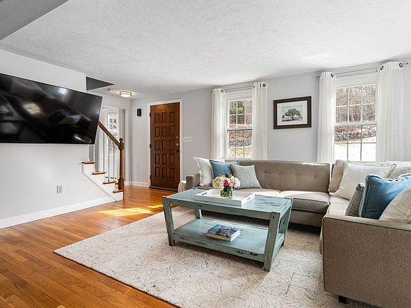 Buyer unable to perform! Set on over 2 acres of land near the highly desirable Barque Hill neighborhood, this inviting gambrel home is ready for new owners! Many updates have been done over the years, including roof, siding, gutters, windows, heating system and tankless hot water system. The bright and open first floor features a spacious mudroom, convenient half bathroom and a kitchen with white cabinetry, granite counters and beautiful hardwood floors throughout. The generous dining room boasts charming exposed beams, a wood-burning stove framed by brick and sliding doors leading to the back deck and scenic, wooded backyard.The bright & inviting living room is perfect for relaxation. Upstairs, you'll find three spacious bedrooms with ample closet space and a full bathroom. The lower level offers versatile space ideal for a playroom, office, or both! Outside, enjoy a waterproofed workspace beneath the deck. All of this, with shopping, parks, bike paths, and highways just minutes away!