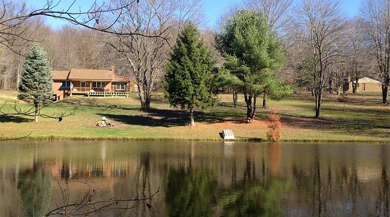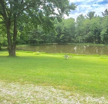 Welcome to this beautiful property surrounded by mature trees, private drive, brick home with front deck overlooking almost an acre pond. House has been completely updated and the furnishings are included. Large fenced in area off of the rear of the house with 6+ car detached garage. Also, situated on the property is an unfinished building with stone fireplace that could be finished into a guest cottage. This is a must see home or weekend retreat.