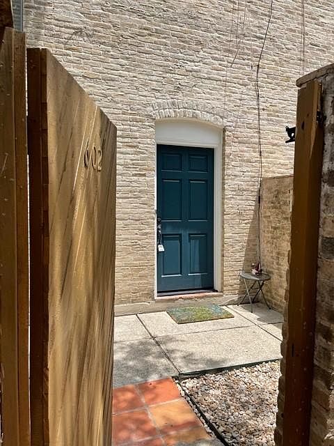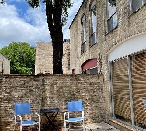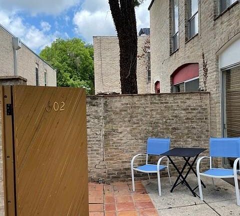 Townhouse style condo makes for easy living in this small, contemporary complex designed by Ken Bentley. Private fenced courtyard leads you into the bright living space with bookshelves and patio access. Saltillo tile flooring, cute kitchen with white cabinets opens to the dining area plus there is a full bath on the first floor. Upstairs two large bedrooms with newer carpet and large walk-in closets share a bath. Bath has dual vanity and shower/tub combo. stacked washer/dryer and refrigerator make this move in ready. Lights are turned off and door locked. Rent includes HOA fees, water, trash p/u, gas, area maintenance and pool access. Tenant pays Electricity!