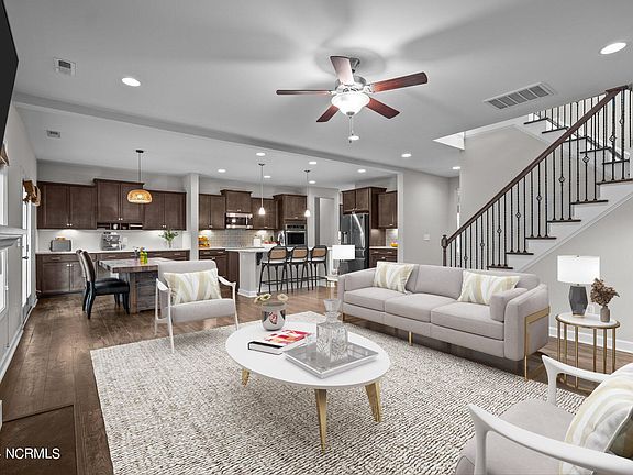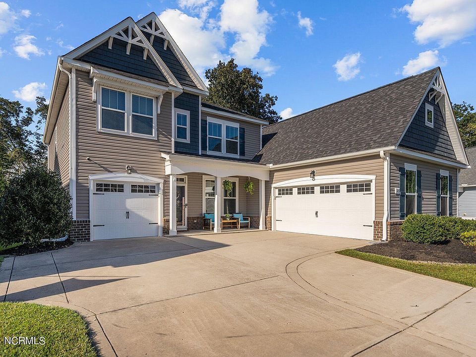 Welcome to 185 Violetear Ridge, a stunning two-story home nestled in the heart of Hampstead's desirable Sparrows Bend neighborhood. This 5-bedroom, 4.5-bathroom residence boasts a two-car garage plus an additional third car garage, all set on a spacious cul-de-sac lot that exudes curb appeal. Step inside to a welcoming foyer that opens to a formal dining room adorned with coffered ceilings and wainscoting. The dining room connects seamlessly to the kitchen through a butler pantry that includes a huge walk-in pantry. The gourmet kitchen features quartz countertops, a subway tile backsplash, stainless steel appliances, double ovens, ample counter and cabinet space, and a large kitchen island. Overlooking the breakfast nook and the expansive living room with a gas-log fireplace, this kitchen is perfect for both everyday living and entertaining. The luxurious master suite, located on the first floor, boasts tray ceilings, dual vanities, a walk-in shower with a rain-shower head, and a spacious walk-in closet. The first floor also includes a convenient half bath and a large laundry room equipped with a dog-washing station. Head upstairs to discover a versatile loft area, four additional bedrooms, and three full bathrooms, providing plenty of space for family and guests. Outside, a covered patio offers a perfect spot for relaxation, overlooking the large, fenced-in backyard. Sparrows Bend is a charming community offering amenities such as a pool and clubhouse, making it a fantastic place to call home.