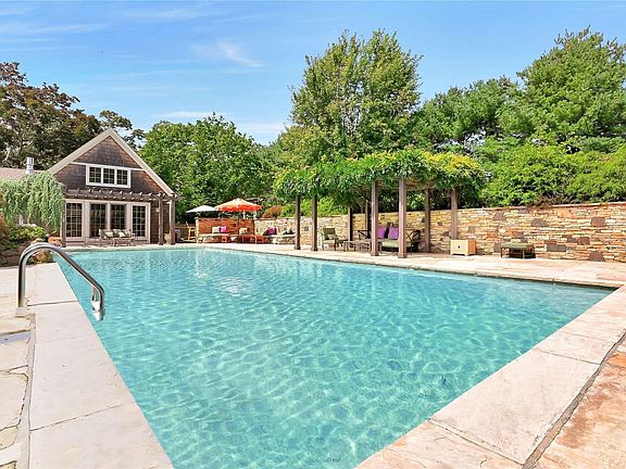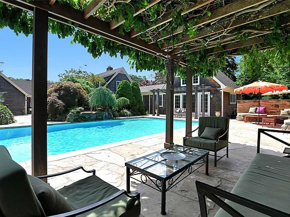 An outdoor oasis is one element of this extraordinary property. This one of a kind 5 bedroom, 3.5 bath residence is the perfect home to make special memories this season. The perfect rental with one of the most extraordinary pool and garden areas on the North Fork. Features a 20' x 50' heated Gunite pool with waterfall, extensive hand cut stone patios, stone walls and numerous outdoor sitting areas. The 1st floor Primary bedroom wing with spacious bedroom (King Bed) and 19 x 18 sitting room with soaring beamed fir ceiling and gas fireplace leads to the pool area. Designed for entertaining, this special home features open sitting /dining area with gas fireplace leading to outdoor living space, open kitchen with 2 wall ovens and 2 stove tops, leading to large living room with gas fireplace. In addition, the first floor boasts a guest bedroom (Queen Bed), bath and home office/den. The second floor offers 3 guest bedrooms and a guest bath. with spacious shower. Close to all North Fork activities including Greenport Village, beaches, area marinas and steps from Islands End public golf course, wineries and restaurants. A truly magnificent property to make special memories this season. 2025 Rates- June- $20K, July- $37,000,, September- $20,000, Call for off-season rates. Rented for June. Permit # 0888.
