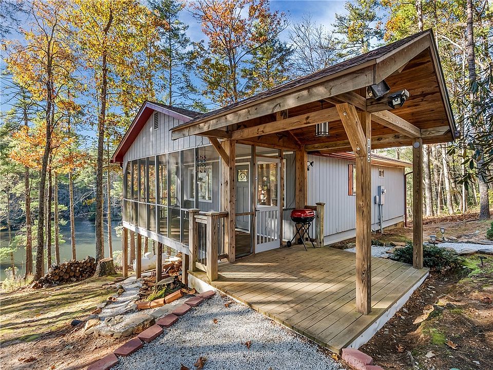 Experience true lakefront living in this serene retreat, perfectly positioned on a quiet cul-de-sac at Mountain Rest Lake. This charming 1-bedroom, 1-bathroom home sits on nearly an acre of pristine lakefront property, offering an idyllic getaway or cozy full-time residence. Nestled along the exclusive shores of private Mountain Rest Lake with your own personal dock, you'll enjoy paddle boarding, canoeing, and the peaceful waters of this non-motorized lake—perfect for those seeking a pure connection with nature. Entering through a spacious screened porch, you're welcomed by stunning lake views that continue as you step into the main living area. The open concept and expansive windows across the back invite abundant natural light, showcasing panoramic views of the lake and lush woodlands. The kitchen impresses with granite countertops, ample cabinetry, and a sleek granite backsplash, making it both functional and inviting. The main bedroom is a true retreat, with a generous walk-in closet that includes a washer and dryer connection. Wake up to nature's beauty through large glass doors that open to a private covered deck, where you can savor morning coffee and breathtaking sunsets over the lake. In addition to the home's charming design, the current owner has thoughtfully completed the spacious walk-in basement insulated and installed gorgeous pine siding, offering a flexible space for finishing in part or fully to use as a bunk room or additional living area. Upgrades include a professional 3-stage WaterTech filtration system, a new Trane AC unit, custom gutters with guards, and ADT security system, ensuring both comfort and safety. A generator-ready plug and wildlife exclusion add to the home's practical features, while newly landscaped paths and juniper trees enhance the natural surroundings. Just minutes from hiking trails, waterfalls, and Oconee State Park, this home is a perfect jumping-off point for mountain adventures and nearby towns like Highlands, NC, and Clayton, GA. Experience the beauty and tranquility of lakefront living at 185 Wren Road—schedule your private tour today!