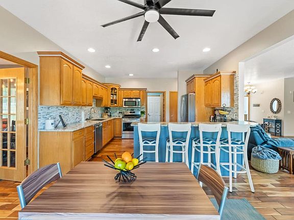Back on Market - Buyer financing woes is your opportunity to own this beautifully updated 4 BR ranch with in-ground sport pool located on the Copper Creek golf course. Step into 9 ' Ceilings, updated acacia wood flooring, and expansive windows with amazing natural light & beautiful views of the pool and golf course. Huge kitchen with updated SS appliances, gas stove, granite, stone backsplash, pantry and separate dining area. Need an office or place for your formal dining table? Got you covered plus french doors for privacy. Mudroom includes sink, shelving, & additional storage. Primary BR includes walk-in closet and huge ensuite with bubble tub, shower & separate vanities. Finished lower level has plenty of storage yet includes 3 additional BRs - 3rd is nonconforming with epoxy flooring, a huge family room, and updated 3rd bath. Updates galore including LP smart siding, garage doors & opener, Pella fiberglass composite windows & slider with built-in blinds, roof, furnace, A/C, water heater...The list goes on. Huge 3+ car garage with plenty of room for cars, toys, & work bench. Fenced backyard with beautiful landscaping, shed, pool, and HUGE partially covered patio is perfect for summer entertaining - call your besties and get the party started. Perfect location - walk to theatre, restaurants, bike/walking trails, and Copper Creek Lake. What more could you want?