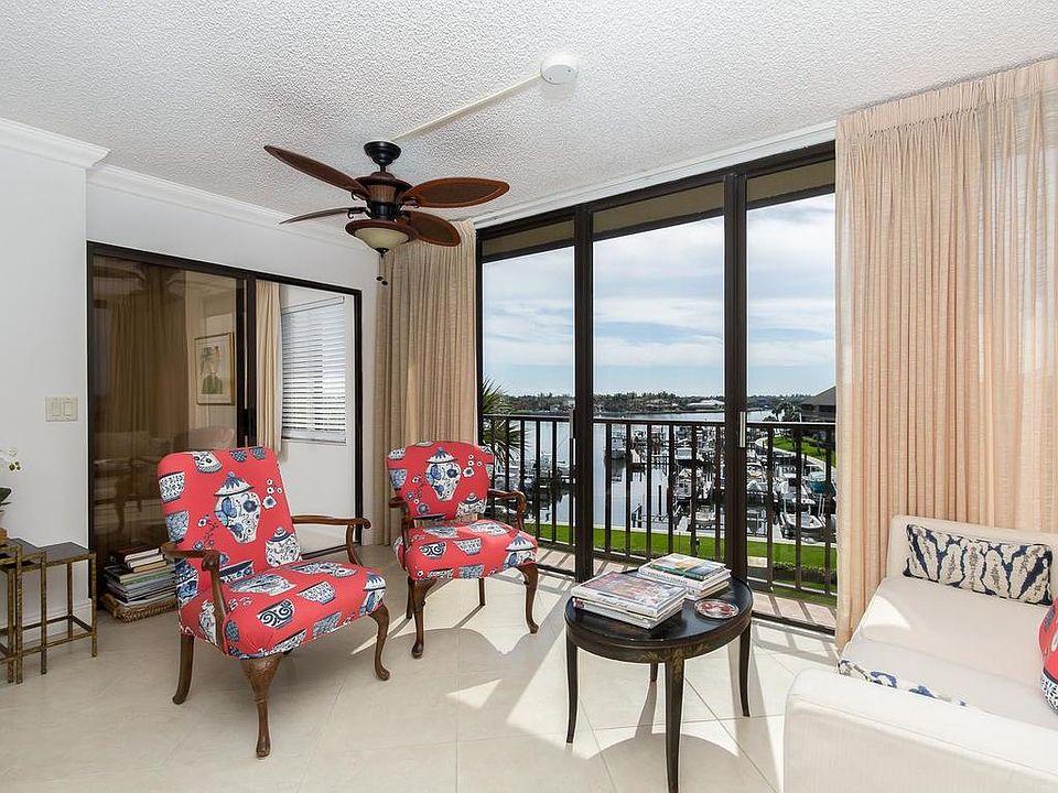 Terrific location in Harbour Side South. Views of the marina on one side, glimpses of the river on the other side. Top floor with southern exposure. Updated kitchen and baths. Shows beautifully! Tile flooring in main living areas. Enclosed porch plus Florida Room. Harbour Side amenities include heated pool, tennis, and access to The Moorings private beach. Sizes approx. Buyer to verify.