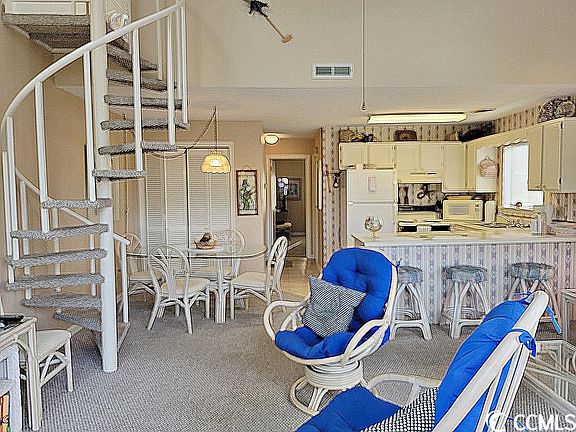 Exceptionally well maintained 2br/2bth 2nd floor townhouse design with spiral staircase to lofted 2nd bedroom. End unit overlooks beautiful pool, jacuzzi and lake. Two 6' sliders lead to a 17x7' open deck. Fully furnished and equipped. Golf Colony Resort is very convenient to beach, shopping and dining. You can take your golf cart to the beach. New roof and low maintenance Hardi siding. HOA includes water/.sewer, pool, jacuzzi, tennis and pickle ball courts, basic cable, internet, reserves and building insurance. One of the most popular condo developments in the area. BACK ON MARKET DUE TO PURCHASER FINANCING FALL THRU