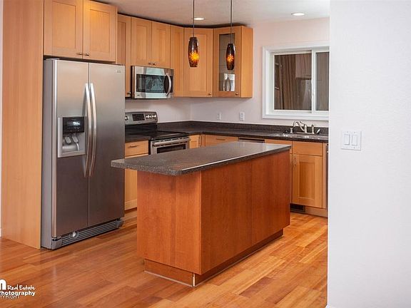 Designed to delight & filled with wonderful surprises! From the generous sized entry & closest all through the main level warm & rich hardwood floors greet you. Beautiful open floor plan living, vaulted ceilings, south facing living room atrium doors, upgraded light fixtures, wood burning natural stone fireplace, dining room/area and WOW...what a kitchen!!! with plenty of storage and work space