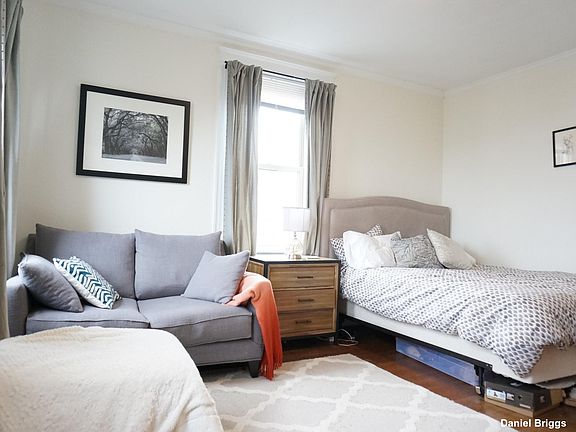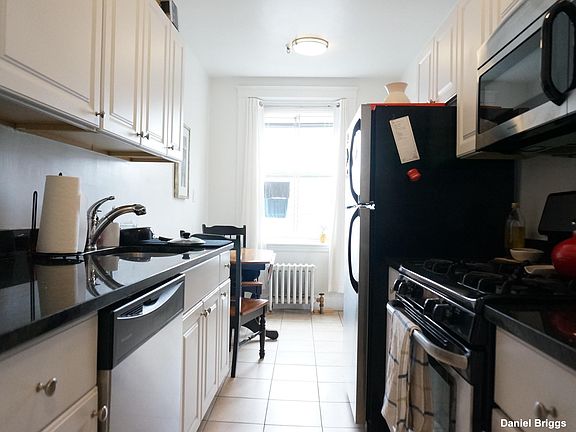 AWESOME building! Elevator, laundry room, fitness room, and common back patio with grills and lounge chairs! Heat and hot water included in the rent. BIG square footage, basically a one bedroom in size! Renovated eat-in kitchen with granite counters and a stainless steel fridge. Wonderful natural light and a bunch of storage space. Living space has a large entry room, and the main living area is both spacious and sunny (south-facing). On the B Line, but a short walk to the C-Line and D-Line. Available July 1st! Contact Dan! Thank you.