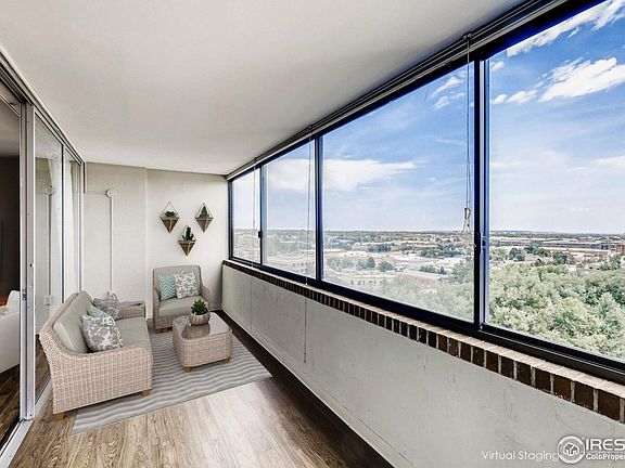 High Rise Living Top Floor (11th floor) 2 bed condo in Boulder's tallest building. Check out the 3D tour link! Spectacular east facing views. Condo has bright light filled floor plan, with attached sunroom, wider hallway, doorways, master suite with walk-in closet, reserved covered parking space. Incredible amenities, pool, hot tub, sauna/steam room, gym, bike storage, community/game room, raised garden beds and more. Phenomenal central location walking biking distance to CU Boulder, Google, Pearl St, 29th Street Mall. HOA fee includes heat cooling, water, trash, cable TV and more. Condo meets many ADA accommodations and modified bath.