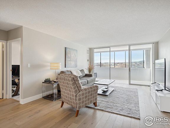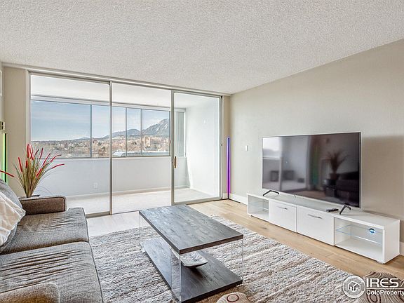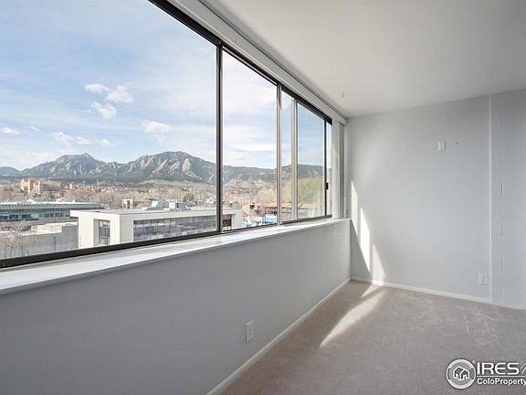 Don't miss this rare end-unit condo with incredible views of the Flatirons and CU campus, located in an unbeatable downtown location in Central Boulder! Beautiful park-like setting offers a community garden, BBQ area, flowers, and streams and a covered, carport space reserved just for your unit. Walk to campus, Pearl St, 29th St Mall, Starbucks, Whole Foods, Trader Joes, or the Dairy Center. The recently renovated building has secure keyless entry, elevators, bike storage as well as a heated indoor pool and hot tub, exercise facility, game room, and community room/kitchen. Sunny and spacious fifth floor unit with amazing views both to the southwest and northeast due to its unique location in the building. Largest one bedroom floorplan with nearly 1000 square feet, including a large bedroom and spacious walk-in closet. New paint and trim, cute kitchen with stainless appliances, white cabinets and updated flooring in the living/dining room. Wonderful neighbors and an awesome community! HOA fee is comprehensive and covers AC, heat, water/sewer, trash, and cable. Service animals only.